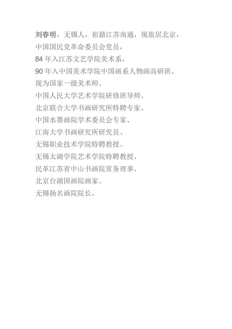刘春明,无锡人,祖籍江苏南通,现旅居北京,84年入江苏文艺学院美术系,90年入中国美术学院中国画系人物画高研班。现为国家一级美术师、中国人民大学艺术学院研修班导师、北京联合大学书画研究所特聘专家、中国水墨画院学术委员会专家、江南大学书画研究所研究员、无锡职业技术学院特聘教授、无锡太湖学院艺术学院特聘教授、民革江苏省中山书画院常务理事、北京台湖国画院画家、无锡扬名画院院长。